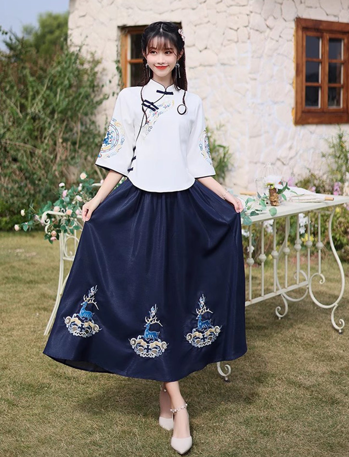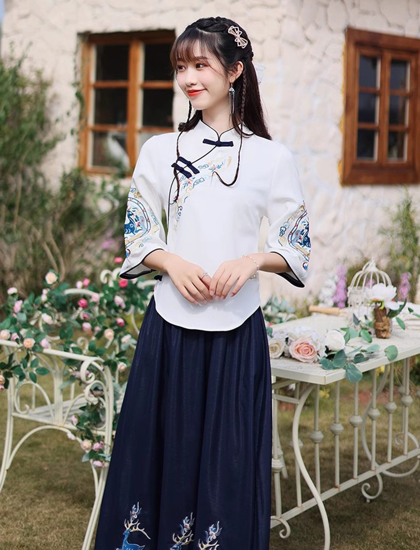 【 风华正茂 】Chinese Style Embroidered Button Retro Modified Cheongsam Skirt Suit